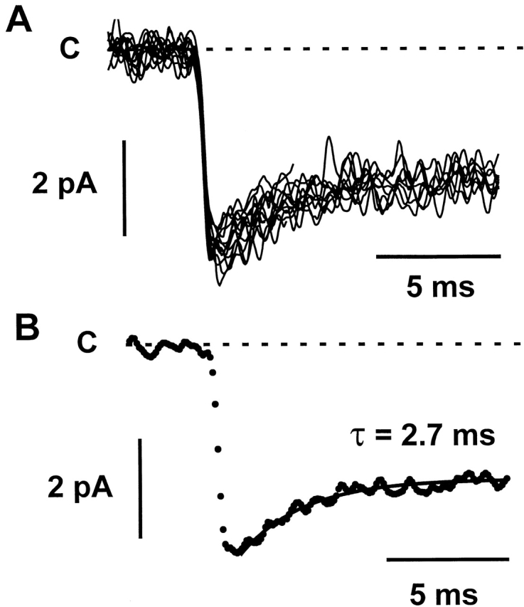 Figure 3. Slow decay of single-channel Tl+ current. (A) 12 selected single-channel current events that exhibit a slow decay are aligned by their initial opening and are superimposed. The currents were recorded at −100 mV in a cell-attached membrane patch with Tl+ as the external permeant ion. (B) The dotted line shows the ensemble average of the traces in A. The decay phase is fitted by a single exponential function with a time constant of 2.7 ms (solid line).