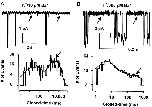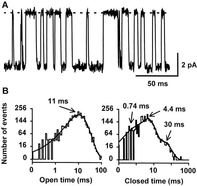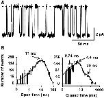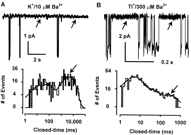 Figure 7. Blockage of single-channel K+ or Tl+ current by external Ba2+. (A and B) Single-channel K+ or Tl+ current were recorded at −100 mV from two separate cell-attached membrane patches with 10 μM (A) or 300 μM (B) Ba2+ in the pipette solution. The arrows in the single-channel traces and in the closed-time distributions indicate Ba2+ blocked states. The dashed lines indicate the zero current level. The current record in A was filtered at 100 Hz and digitized at 2 KHz.