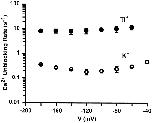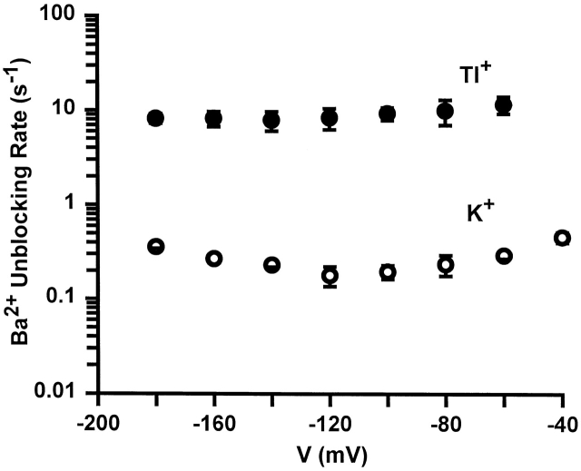 Figure 8. Tl+ speeds up dissociation of Ba2+ from the channel. The Ba2+ unblocking rate determined from single-channel recordings is plotted against the membrane potential with either K+ or Tl+ as the external permeant ion (n = 3–9).