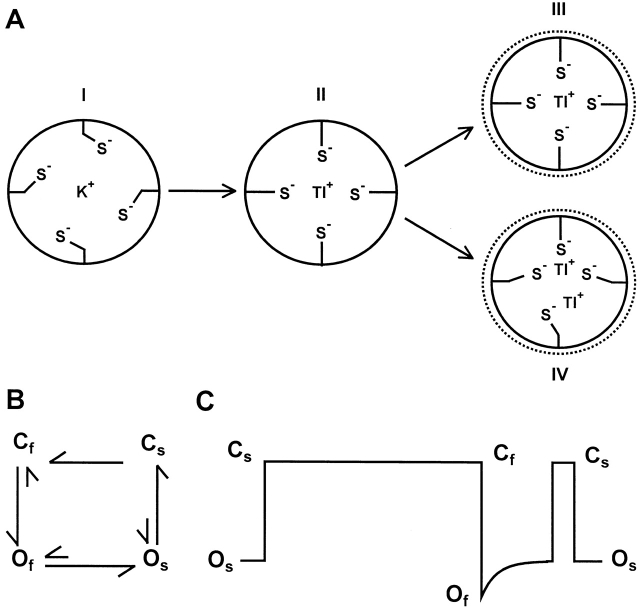 Figure 9. Models of Tl+ interaction with the thiolate groups of C169 and open↔ close transitions of channels in the presence external Tl+. (A) The schematics represent cross sections of the pore at the position of C169. Under our recording conditions, the external and internal permeant ion species are Tl+ and K+, respectively. When the channel is closed, due to conformational changes in the selectivity filter, the cavity is equilibrated with the internal solution and is presumably occupied by K+, which interacts weakly with the thiolate groups (I). As Tl+ permeates the cavity immediately following channel opening, it induces a reorientation of the thiolate groups and seeks to form an optimal coordination (II). This process triggers a slow conformational change of the pore, such as a constriction (but the exact nature of the conformational change is unclear). Two models are proposed for the subsequent interaction between Tl+ and the thiolate groups. In one case (III), the permeating Tl+ is optimally coordinated by all four thiolate groups, but its residence time is <50 ns. In another case (IV), a Tl+ is optimally and tightly coordinated by three thiolate groups, and the cavity is sufficiently wide to permit Tl+ ions to flow by the bound Tl+. (B) A qualitative model of transitions among the proposed closed and open states in the presence of external Tl+ (discussion). (C) An idealized single-channel Tl+ current trace. The two predominant types of channel openings, Cf to Of and Cs to Os, are preceded by two and one closed states, respectively.