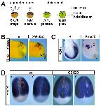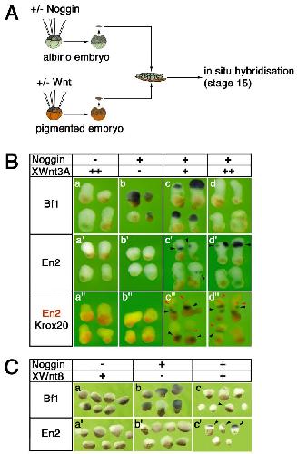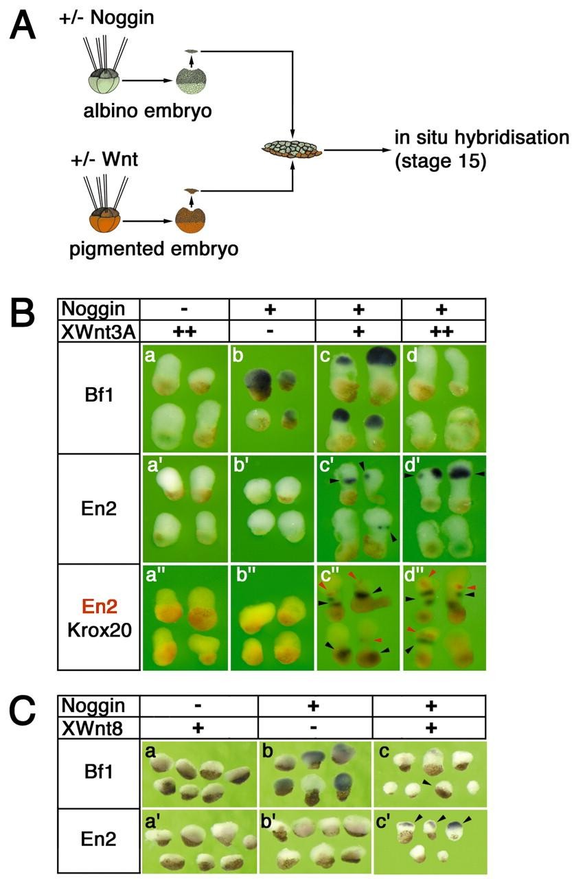 Fig. 2. Localized expression of Wnts induces a polar AP neural pattern at long range in animal caps. (A) Experimental design: at the eight-cell stage, albino embryos were injected with 0.25 ng/blastomere noggin mRNA and pigmented embryos were injected with Xwnt3A mRNA (B) or pCSKA-Xwnt8 (C) into the four animal blastomeres. Animal caps were explanted at late blastula stage and sandwiched to yield pigmented/unpigmented conjugates. The conjugates were cultured until control siblings reached stage 15 and marker gene expression was analysed by in situ hybridization. Between 12-40 conjugates were analysed in B,C, of which representative samples are shown with albino halves of the conjugates always pointing to the top. (B) Animal cap conjugates from uninjected or Noggin-injected albino embryos and pigmented embryos injected with nil, 0.1 (+) or 1 ng/blastomere (++) Xwnt3A mRNA were analysed for the expression of Bf1, En2 and Krox20 as indicated. Note that in dâ²â² an organized AP pattern is generated with the more posterior Krox20 closer to the pigmented cap than En2. (C) Animal cap conjugates from uninjected or Noggin-injected albino embryos and pigmented embryos which were uninjected or injected with 0.05 ng/blastomere pCSKA-Xwnt8 were analysed for the expression of Bf1 and En2 by in situ hybridization.