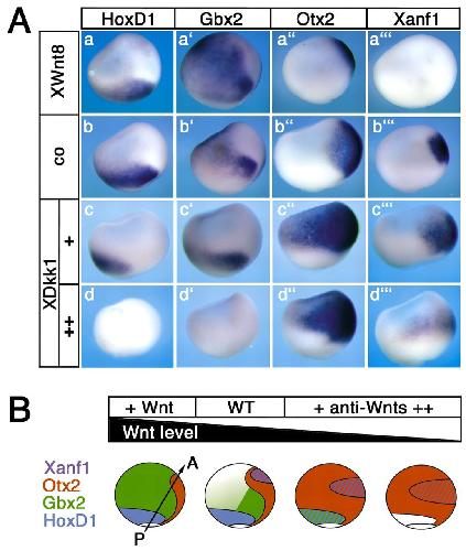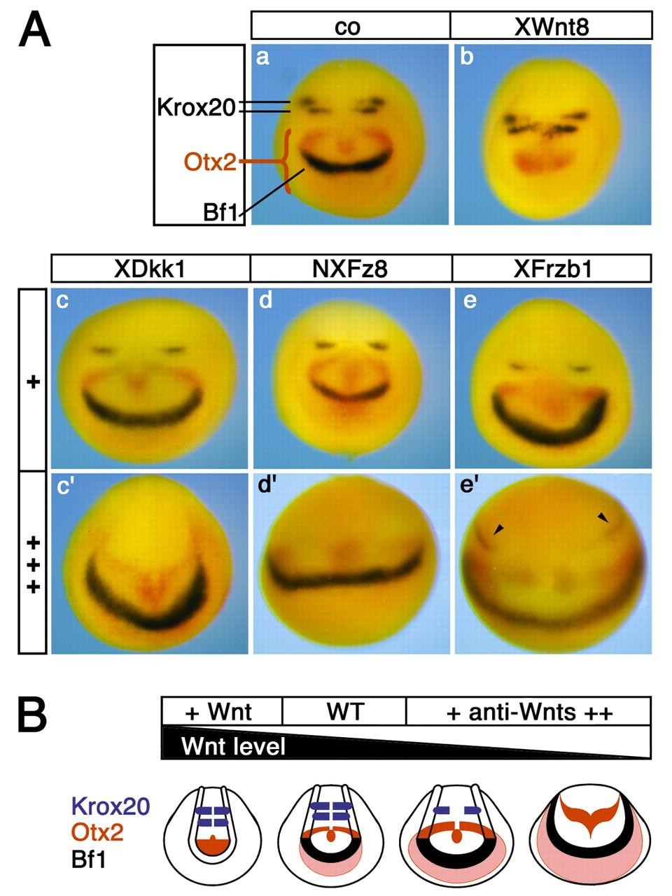 Fig. 4. Regulation of AP neural patterning by Wnt signalling in neurulae. (A) Albino embryos were uninjected or injected at the eight-cell stage into the four animal blastomeres with 0.05 ng/blastomere pCSKA-Xwnt8, 0.05 ng/blastomere or 0.2 ng/blastomere Xdkk1 mRNA, 0.1 ng/blastomere or 0.4 ng/blastomere NXfz8 mRNA, 0.8 ng/blastomere or 1.6 ng/blastomere Xfrzb1 mRNA. Embryos were cultured until neural plate stage (stage 15) and analysed by triple in situ hybridization for the expression of Krox20, Bf1 (black) and Otx2 (red). Frontal views are shown, dorsal points towards the top. In a, the expression domains of Bf1, Otx2 and Krox20 (rhombomeres 3 and 5) are indicated. Note residual Krox20 expression for highest doses of XFrzb1 (arrowheads in eâ²) but not XDkk1 (câ²) or NXFz8 (dâ²). 25-35 embryos were analysed per sample in three independent experiments. (B) Summary of the results shown in A. Colour code of gene expression is on the left. WT, wild-type embryo with normal Wnt levels.
