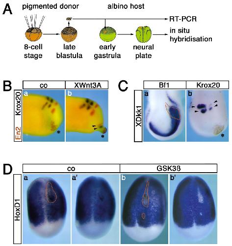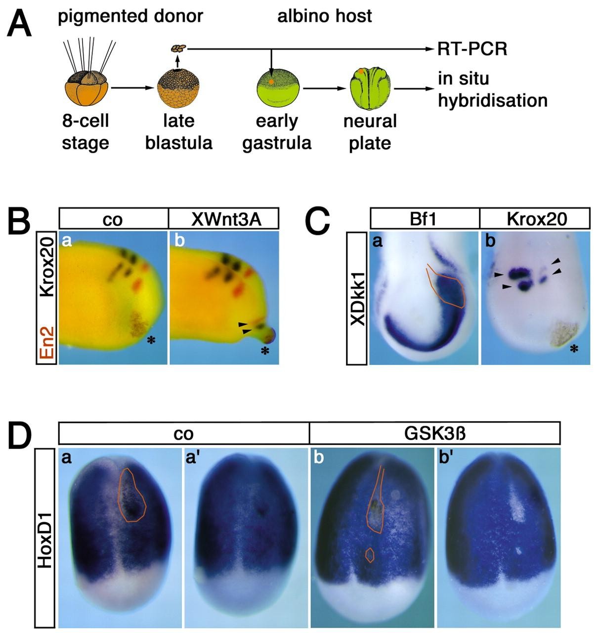 Fig. 5. Wnt signalling is necessary and sufficient to pattern neuroectoderm in a long-range fashion. (A) Experimental design: pigmented 8-cell stage embryos (donors) were injected into the four animal blastomeres with mRNAs encoding Wnt pathway activators or Wnt antagonists. At late blastula stage, small groups of pigmented animal cap cells were grafted into the presumptive neural plate of early gastrula albino embryos (hosts). The hosts were cultured until neurula stages and analysed for marker gene expression by in situ hybridization. (B) Grafted donor caps were uninjected (a) or injected with 0.25 ng/blastomere Xwnt3A mRNA (b) and placed in the presumptive anterior host neural plate. Embryos were analysed at neural plate stage for expression of Krox20 (black) and En2 (red) and are shown in lateral view, dorsal side upwards. Grafts are indicated by asterisks. Note ectopic induction of En2 and Krox20 with reversed AP polarity by the Xwnt3A expressing graft (arrowheads in b). (C) Grafted donors were injected with 0.25 ng/blastomereXdkk1 mRNA and placed in the presumptive posterior (a) or anterior (b) host neural plate, respectively. Embryos were analysed at neural plate stage for expression of Bf1 (a) and Krox20 (b) and are shown in dorsofrontal view. Grafted tissue is outlined in red in panel a. Note posterior expansion of Bf1 expression in a and downregulation of Krox20 (arrowheads in b). (D) Grafted donors were uninjected (a,aâ²) or injected with 1.5 ng/blastomereXgsk3β mRNA (b,bâ²) and placed in the presumptive posterior host neural plate. Embryos were analysed at neural plate stage for expression of HoxD1 and are shown in dorsal view, anterior down. Grafted tissue is outlined in red in panels a,b. The same embryos as in panels a,b are shown following bleaching in panels aâ²,bâ². Note holes in HoxD1 expression in panel bâ² compared to continuous expression in panel aâ².