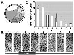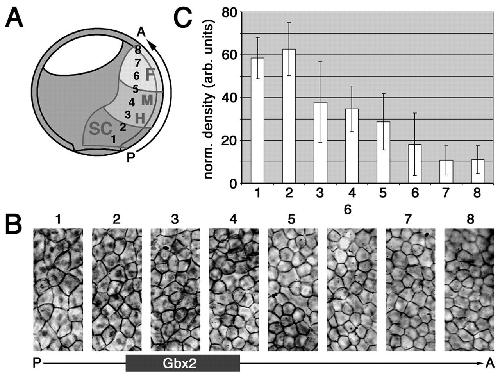 Fig. 8. An AP gradient of nuclear β-catenin in the presumptive neural plate during gastrulation. (A) Mid-gastrula embryos were cut sagittally and left and right halves were analysed by in situ hybridization for Gbx2 expression and by immunostaining for β-catenin, respectively. Eight consecutive regions of the presumptive neuroectoderm of immunostained halves were selected from posterior to anterior positions, according to the gastrula fate map. Corresponding windows are shown in B for one representative embryo. Note prominent nuclear staining in windows 1 and 2, and absence of nuclear staining in 7 and 8. The AP axis is indicated (PâA) and the approximate position of the Gbx2 expression domain is given in relation to the windows. Data in C represent mean normalized densities of the nuclear regions of all cells within a window.
