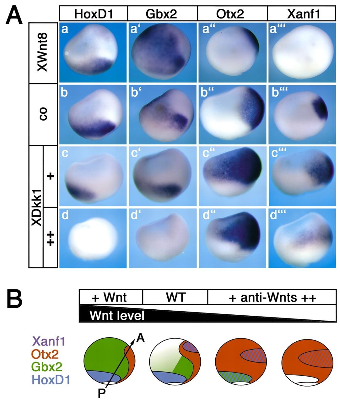 Fig. 3. Wnt signalling regulates AP patterning in gastrula ectoderm. (A) Albino embryos were uninjected (co) or injected at the eight-cell stage into the four animal blastomeres with 0.05 ng/blastomere pCSKA-Xwnt8, 0.05 ng/blastomere (+) or 0.2 ng/blastomere (++) Xdkk1 mRNA. The embryos were cultured until late gastrula stage (stage 12) and analysed by in situ hybridization for the expression of HoxD1, Gbx2, Otx2 and Xanf1. Lateral views are shown, dorsal points to the right. 12-18 embryos were analysed per sample in three independent experiments. (B) Summary of the results shown in A. Colour code of gene expression domains is on the left. The approximate orientation of the prospective ectodermal AP axis is indicated on the left (PâA). WT, wild-type embryo with normal Wnt levels.