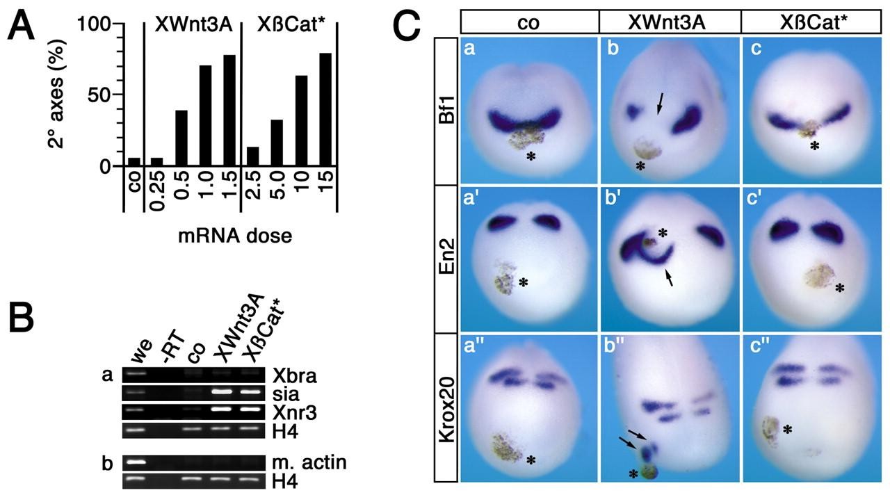 Fig. 6. Long-range patterning of neuroectoderm by XWnt3A is direct. (A) Titration of Xwnt3A and Xβcat* mRNAs. For every mRNA concentration (in pg/nl), 15 embryos were injected at four- to eight-cell stages vegetally into two opposite blastomeres (2.5 nl/blastomere), cultured until tailbud stage and scored for the induction of secondary body axes. Comparable results were obtained in four independent experiments. (B) RT-PCR analysis of expression of the indicated marker genes at (a) early gastrula stage (stage 10+) and (b) neural plate stage (stage 15) in whole embryos (we) and animal caps cut from embryos injected at the eight-cell stage into the four animal blastomeres with no (co), 0.25 ng/blastomere Xwnt3A or 2.5 ng/blastomere Xβcat* mRNAs. H4, histone4 for normalization; âRT, negative control without reverse transcriptase. (C) Pigmented donors uninjected (co) or injected with 0.25 ng/blastomere Xwnt3A or 2.5 ng/ blastomere Xβcat* mRNA were grafted as depicted in Fig. 5A into the presumptive host anterior neural plate. Embryos were analysed at neural plate stage (stage 15) for expression of Bf1, En2 and Krox20. Frontal views are shown (dorsofrontal in bâ²â²,câ²â²). Between 21 and 63 embryos were analysed for every type of transplant in six independent experiments. Note that Xβcat*-expressing grafts do not induce changes in host marker gene expression unlike Xwnt3A (arrows), even at 5 ng/blastomere (not shown).