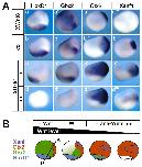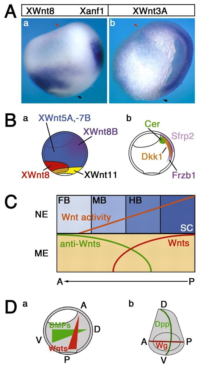 Fig. 9. Expression of various Wnts and Wnt antagonists establishes a Wnt activity gradient in the gastrulating Xenopus embryo. (A) Expression of Xanf1, Xwnt8 (a) in whole-mount and Xwnt3A (b) in sagittal section at late gastrula stage by in situ hybridization. Black arrowheads, dorsal blastopore lip; red arrowheads, leading edge. Note expression of Xwnt8 in proximity to presumptive posterior neuroectoderm (compare with fate map in Fig. 8A). Xwnt3A is expressed in chordamesoderm and in a ring surrounding the blastopore (not visible). (B) Expression domains in the late Xenopus gastrula of Wnts (a) and Wnt antagonists (b). Only ectodermal expressions are shown in a. The circumblastoporal expression of Xwnt3A is not depicted for simplicity. Note expression of Wnt antagonists in the anterior of the gastrulating embryo. (C) Simplified model for AP patterning of neuroectoderm by a Wnt activity gradient in Xenopus. Wnts (red) and Wnt antagonists (green) are expressed in the mesendoderm (ME, ochre) underlying the neuroectoderm (NE, blue). The expression of Wnts and Wnt antagonist in the neuroectoderm is not shown for simplicity (see B). Their combined activities result in the formation of a Wnt signalling gradient (dark orange) that patterns the AP neuraxis. The AP axis is indicated (AâP). Formation of the posterior nervous system also requires other factors (FGFs, RA) which are not shown here. (D) The AP and DV axes in the gastrulating Xenopus embryo are patterned by gradients of Wnts and BMPs, respectively (a). The Drosophila wing imaginal disc is patterned by gradients of Wingless (Wg) and Decapentaplegic (Dpp), which are secreted along the DV and AP compartment boundaries, respectively (b).