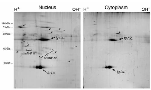 (right panel). The positions of hnRNP A1, A2, B1, B2, and K, are indicated on the silver-stained gel.
