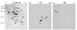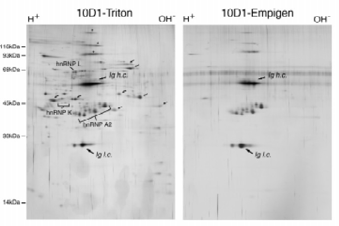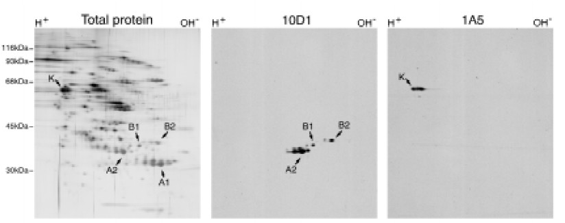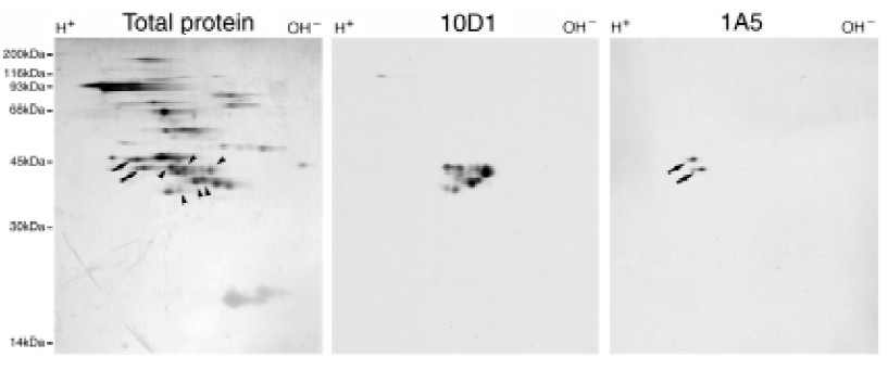 were resolved by two-dimensional gel electrophoresis. Proteins were visualized by silver staining (left panel), or by immunoblotting with 10D1 (middle panel) or 1A5