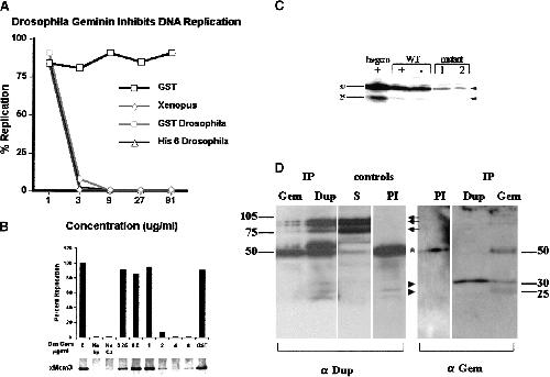 Drosophila Geminin inhibits DNA replication in Xenopus extracts by preventing Mcm loading and interacts with Drosophila Cdt1(Dup) in vivo. (A)Drosophila (Dm) Geminin inhibits DNA replication inXenopus extracts. Purified Xl Geminin (⋄), GST-Dm Geminin (○), His-6 Dm Geminin (▵), or GST (□) were added at the concentrations shown to a Xenopus DNA replication in vitro assay system. Replication assays were carried out as described previously (McGarry and Kirschner 1998). (B) Dm Geminin inhibits Mcm loading. The indicated amounts of Dm Geminin were added to the Xenopus in vitro assay system and DNA replication measured (top) or the chromatin binding of xMcm3 determined (bottom). Concentrations of Dm Geminin that inhibit DNA replication (top) strongly inhibited xMcm3 chromatin binding. The GST control added at a concentration of 8 μg/mL had no effect on DNA replication or xMcm3 binding. In the control tracks (no sperm DNA or no calcium), DNA replication and xMcm3 binding were not observed. (C) Anti-Dm Geminin Western analysis. Dm Geminin bands are indicated (arrowheads). The faint band above 30 kD is a background band caused by the secondary antibody (data not shown). No Dm Geminin antibody reacting bands were detected elsewhere on the gel (data not shown). (WT) Wild type; (Hs-Gem) heat shocked hsp70–GAL4 UAS–Dm geminin embryos; (mutant 1) l(2)k14019/CyO; and (mutant 2)l(2)k03202/CyO. (+) Heat shocked. Equal amounts of protein were loaded per track. (D) Dm Dup(Cdt1) and Dm Geminin form a complex in Drosophila embryos. Dup or Dm Geminin were immunoprecipitated from embryonic extracts and the precipitate analyzed by immunoblotting with the Dup antibody (left) or Dm Geminin antibody (right). (Left) Dup bands (arrows); Dm Geminin bands (arrowheads); and IgG heavy chain (*) are indicated. Controls, (S) Supernatant; (PI) preimmune sera.