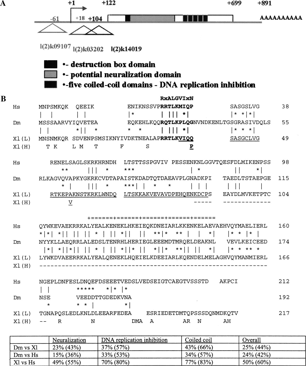 Drosophila Geminin and comparison withXenopus and human Geminin. (A) Drosophila(Dm) geminin gene structure showing location ofP-element alleles relative to the transcriptional unit. (B) Sequence comparison with Xenopus (Xl) and human (Hs) Geminin. The sequences were aligned using the GCG Gap program. Identical amino acids are marked with a vertical line and conservative changes are indicated (*). Differences between Xl H and L forms are indicated. The putative destruction box is in boldface type. The neuralization domain is underlined and the DNA replication inhibition domain is indicated by the broken underline. The double line above the sequence alignment shows the coiled-coil region. The degree of identity and similarity (in parentheses) between Xl Geminin L, Hs and Dm Geminin sequences is indicated for each domain.