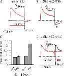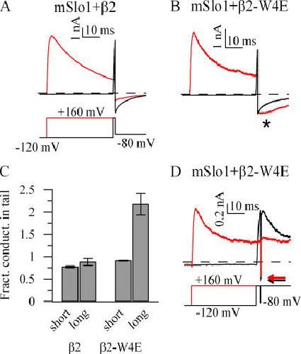 Figure 2. β2-W4E channels redistribute extremely rapidly between inactive and conducting conformations. Channels expressing mSlo1+β2 (A) or mSlo1+β2-W4E (B) were depolarized for 1 ms (black) or 40 ms (red) and allowed to recover as shown. After 40-ms depolarizations, mSlo1+β2-W4E displayed an approximately twofold increase in conductance associated with repolarization (*). (C) Fractional change in instantaneous tail current conductance at −80 mV compared with conductance at +160 mV, immediately before repolarization (β2, n = 6; β2-W4E, n = 3; error bars, ±SEM). (D) A patch expressing mSlo1+β2-W4E was subjected to the indicated voltage protocol. Again, tail current conductance is increased immediately after a long depolarizing prepulse; arrows indicate the instantaneous tail current value during the brief repolarization. This increase is reversed immediately after the onset of a second depolarizing pulse.
