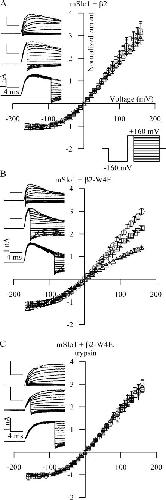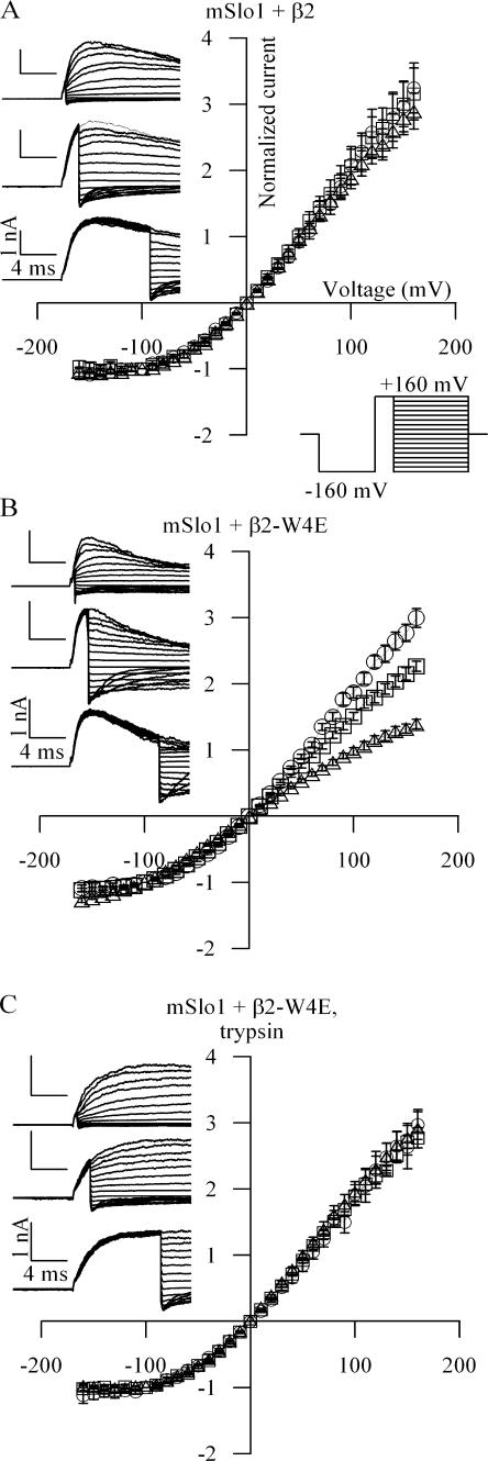 Figure 4. Instantaneous current–voltage relationships change with activation step duration. This change requires that channels occupy multiple distinct open states, one of which is in rapid equilibrium with an inactivated state. (A) Patches expressing mSlo1+β2 channels were activated with the indicated voltage protocol, with a depolarizing prepulse lasting 0.5 ms (top traces), 2 ms (middle traces), and 10 ms (bottom traces). For display purposes, raw currents are shown at 20-mV increments. Current was measured 120 μs after the onset of the voltage step from the prepulse potential, after settling of the capacitance transient. For each protocol, these currents were normalized to the value recorded at −100 mV and plotted as follows: ◯, 0.5 ms; □, 2 ms; △, 10 ms (n = 6). (B) Patches expressing mSlo1+β2-W4E were recorded as in A (n = 7). (C) Patches expressing mSlo1+β2-W4E were treated with trypsin (1 mg/ml) at the cytoplasmic face until modification of macroscopic current was complete. Trypsin-modified patches were then recorded as above (n = 4).
