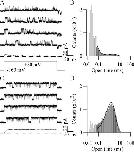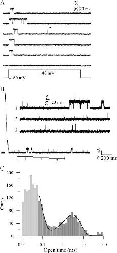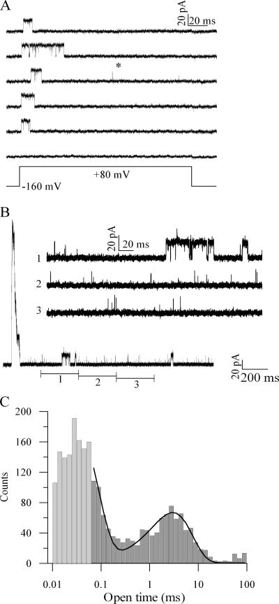 Figure 6. Wild-type channels undergo occasional short-lived reopenings. (A) Recordings from a patch containing one mSlo1+β2 channel using the voltage protocol shown. A single brief reopening is shown (*). (B) Recording from a patch containing at least 15 mSlo1+β2 channels during a lengthy depolarization to +80 mV. Insets 1–3 show segments of this trace on an expanded baseline. (C) Histogram of open-time durations from this patch, with bins distributed logarithmically. Events less than twice the filter rise time (2Tr = 66 μs) are shown in lighter gray. Line shows a fit to the data with a double exponential decay. Only events >2Tr were included in the fit. τslow = 3.0 ms.