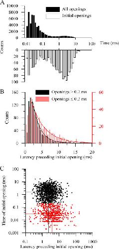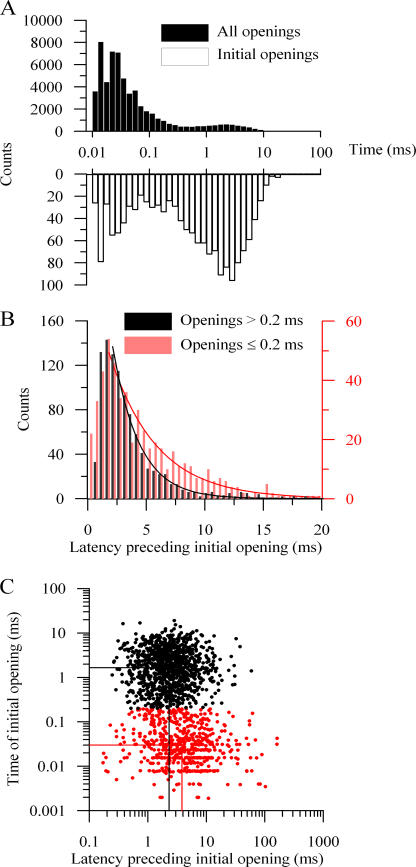 Figure 7. Channels arrive at initial long- and short-lived open-ings by different kinetic paths. (A) Histograms of open-time duration for all openings (solid bars) and initial openings (open bars) of a single mSlo1+β2-W4E channel after depolarizations to +80 mV. Bins are spaced logarithmically. (B) Histograms of the latency before initial opening, binned linearly and segregated by the duration of this first opening. Initial openings were categorized into two groups, those lasting >0.2 ms and those <0.2 ms, based on the nadir between the two components of the open-time histograms shown in A. Lines show single-exponential fits to the decaying phases of the latency histograms (latencies ≥2 ms). For openings >0.2 ms (black), τ = 2.2 ms; for openings ≤0.2 ms (red), τ = 4.0 ms. (C) Scatterplot displaying the durations of initial openings versus the durations of the latency before opening. Events were again segregated as “short” (red) or “long” (black) by a criterion of 0.2 ms. Lines show the average duration and latency (computed logarithmically) for each population. For long events, the average latency was 2.31 ms (mean ± SEM, 2.25–2.38 ms, n = 1022). For short events, the average latency was 3.86 ms (mean ± SEM, 3.68–4.05 ms, n = 558).
