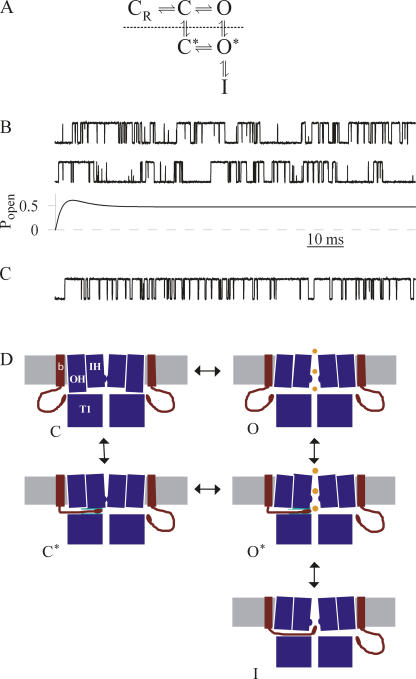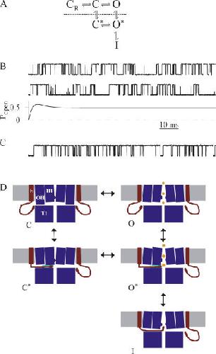 Figure 8. Models of preinactivation. (A) A six-state Markov scheme incorporating Scheme 3 with the addition of an extra, nonconducting resting state, CR. In the absence of allosteric coupling, rate constants on opposite sides of the central loop are assumed to be identical (e.g., kC→C* = kO→O*) To simulate removal of inactivation by trypsin, all states below the dotted line were removed. (B) Predictions of the scheme shown in A, with rate constants as listed in Table I. Rate constants were estimated from data acquired at +80 mV and 10 μM Ca2+. Top two traces, simulated single channel data, superimposed on 1 pA RMS noise, digitally lowpass filtered at 10 kHz. Bottom trace, simulated macroscopic current at +80 mV. Dotted line is zero-current level. (C) Simulated single-channel data after removal of inactivation by “trypsin,” processed as above. (D) A structural conception of the preinactivated state. Images depict a cartoon showing two opposing α subunits from the mSlo1 tetramer, flanked by two β2 subunits. The five states shown correspond to those in Scheme 3. β, β2 subunit; OH, outer helix bundle (S0–S4); IH, inner helix bundle (S5–S6); T1, channel cytoplasmic domain (see Long et al., 2005). The depolarization-induced change permissive for preinactivation is represented as movement at the cytoplasmic face of the outer helix bundle. Possible locations for the interaction associated with preinactivation are shown in green in the C* and O* states.