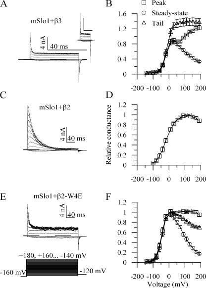 Figure 1. The W4E mutation renders β2-mediated BK current inactivation properties similar to those of β3b. (A) Currents from a patch expressing mSlo1+β3b channels in response to a family of depolarizations. Inset shows the same currents on a time scale equivalent to C and E. (B) Normalized conductance data from mSlo1+β3b channels. Peak (□), steady-state (◯), and tail (△) currents were measured. Peak currents ≤40 mV were fit with a Boltzmann equation, and all current values were normalized to the positive asymptote of this fit (n = 8). (C) Current arising from a patch expressing mSlo1+β2 channels. (D) Normalized peak conductance data from mSlo1+β2. (n = 11) (E) Current arising from a patch expressing mSlo1+β2-W4E channels. (F) Normalized peak, steady-state, and tail current values calculated as for B (n = 10).