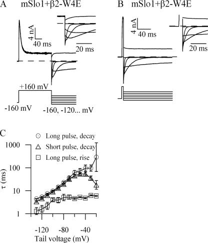 Figure 3. Inactivation of β2-W4E is associated with biphasic tail currents. (A) mSlo1+β2-W4E tail currents at 40 mV increments, after a 200-ms depolarization as shown. (B) mSlo1+β2-W4E tail currents at 40-mV increments, after a 5-ms depolarization as shown. Insets show tail currents on an expanded time base. (C) Time constants of exponential fits to tail currents from mSlo1+β2-W4E. Tail currents after short depolarizations were fit with single exponentials, and tail currents after long depolarizations were fit with the sums of two exponentials. ◯, decaying phase after long depolarization; □, rising phase after long depolarization; △, decaying phase after short depolarization (n = 4).