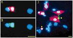 and XAP-2 (B) antibodies (red), which are normally expressed, in both cases, in the host and the
