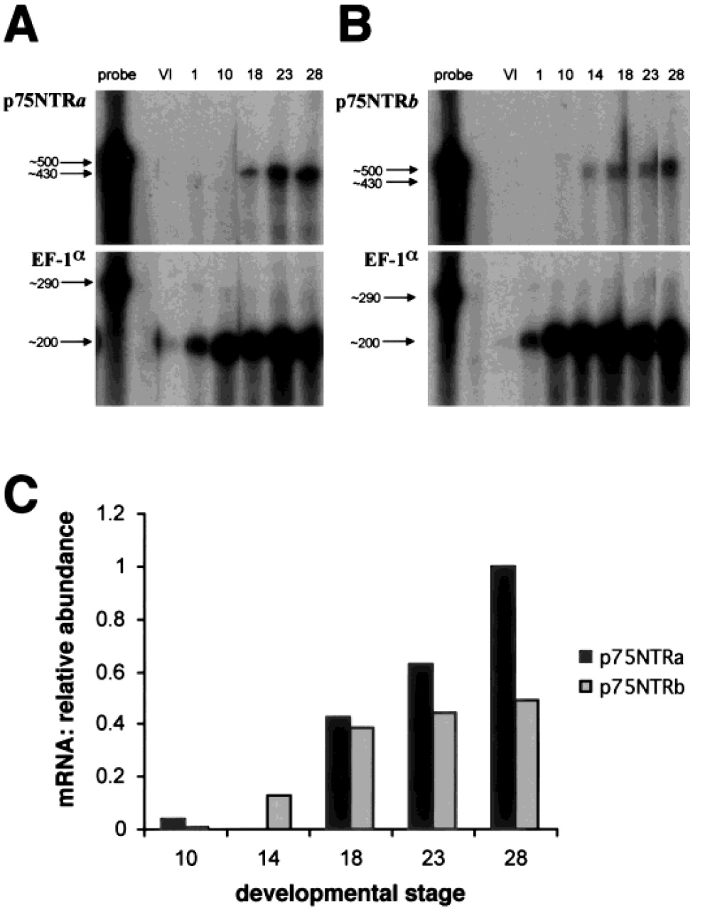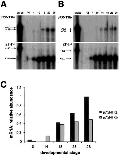 Figure 3 RNase protection assays showing developmental expression of p75NTRa and p75NTRb.