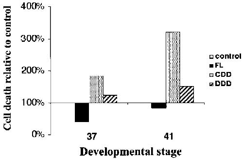 Two relative peaks in cell death are observed at stage 37/38 and stage 47. Mitotic index redrawn
