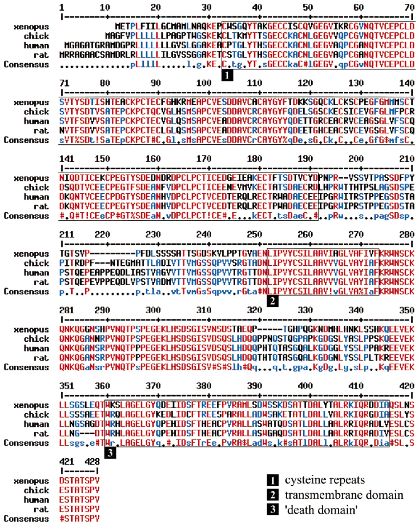 Figure 2 Multiple sequence alignment between conceptually translated Xenopus p75NTRa and