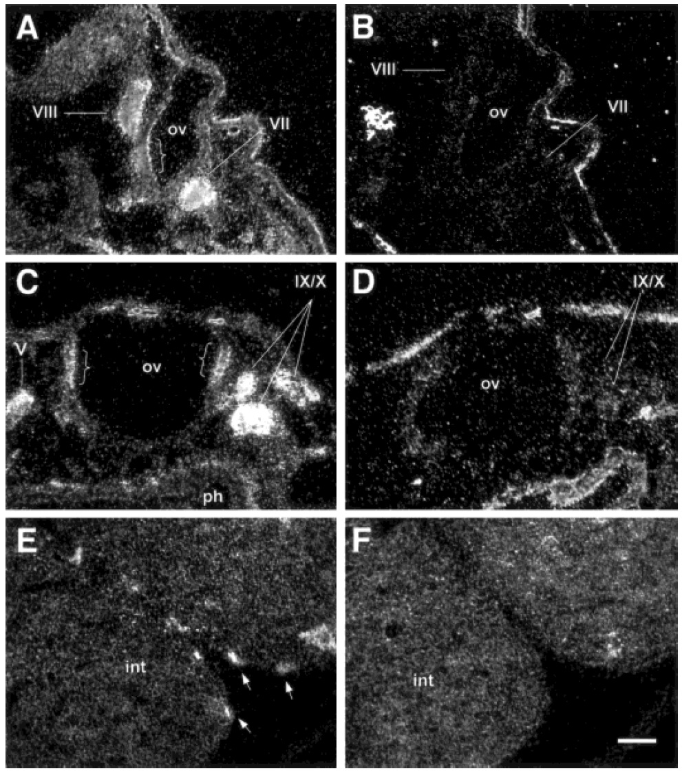 sensory epithelium of the otic vesicle (bracket) and in seventh and eighth cranial ganglia. (B)