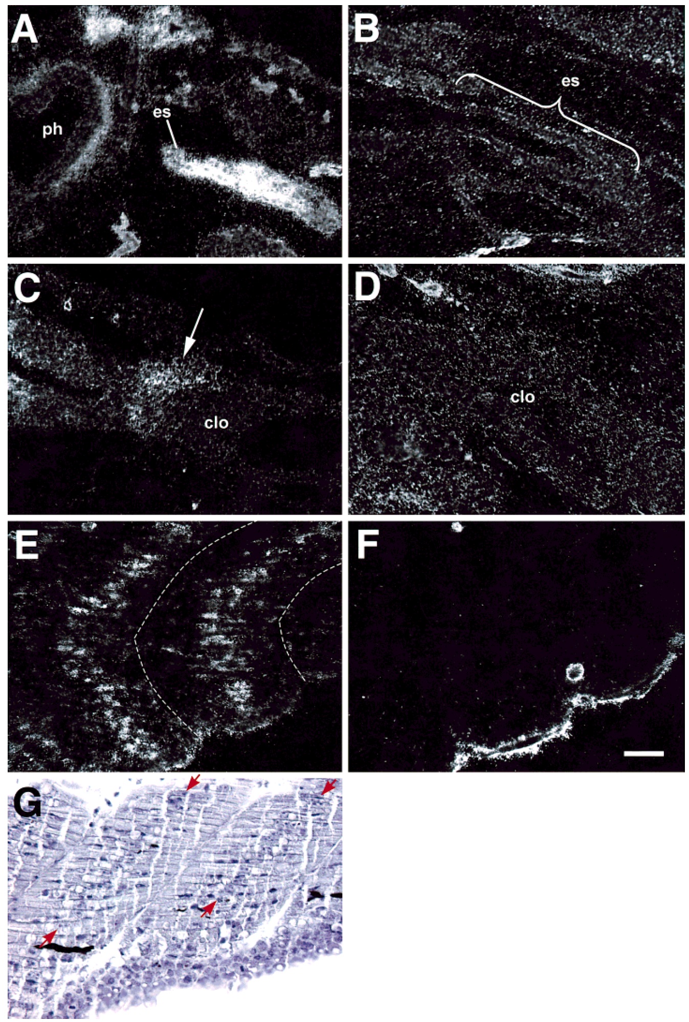 boundaries are indicated by dotted lines. (F) Sense strand control. (G) Hematoxylin stained section