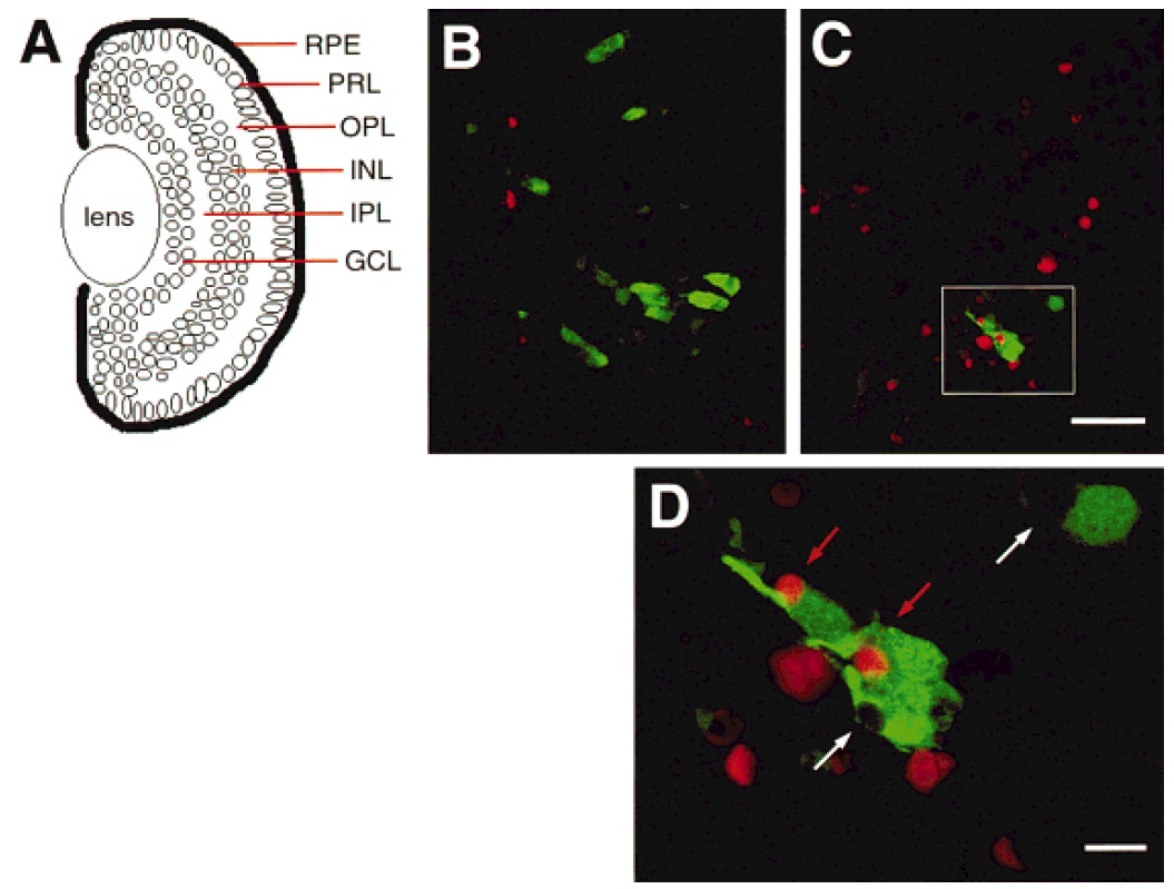 (C). Red arrows indicate GFP-positive cells with TUNEL-positive nuclei. White arrows indicate