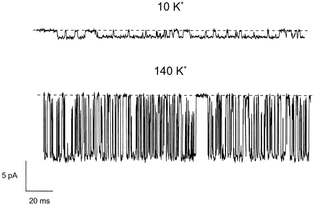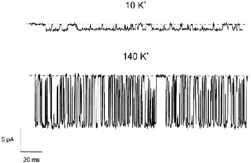 Figure 1. (A) Single-channel currents recorded at −130 mV from two different inside-out patches excised from an oocyte expressing Kir6.2 and SUR1. Currents were recorded in the presence of 10 mM (above) or 140 mM (below) symmetrical K+ solutions. The dashed line indicates the zero current level.