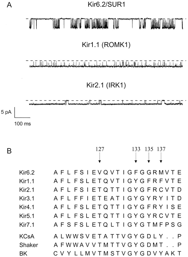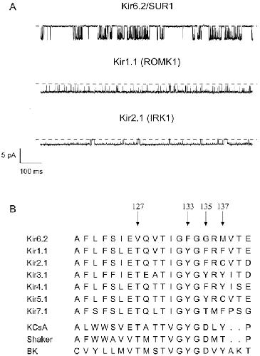 Figure 2. (A) Single-channel currents recorded at −60 mV from an inside-out patch excised from an oocyte expressing Kir6.2/SUR1, Kir1.1, or Kir2.1, as indicated. Currents were recorded in a symmetrical 140-mM solution. The dashed line indicates the zero current level. (B) Sequence of the pore loop of Kir6.2 compared with that of some other types of K+ channel. Arrows indicate the mutated residues.