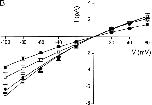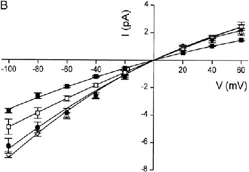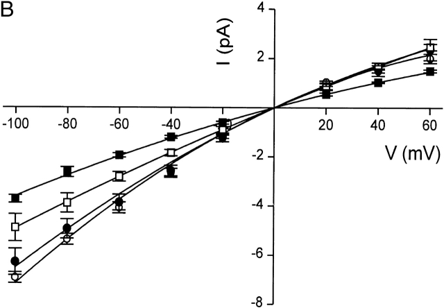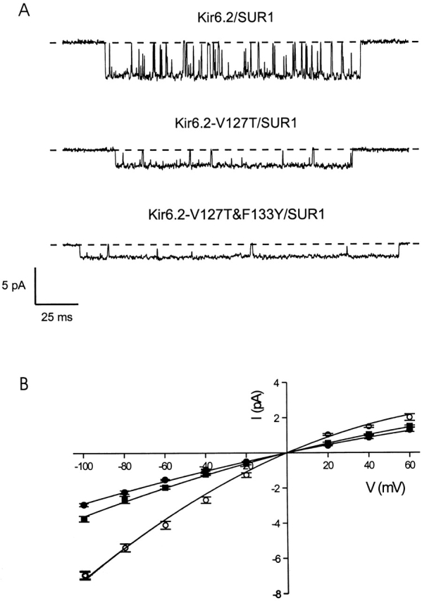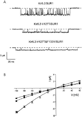Figure 5. (A) Single-channel currents recorded at −60 mV from an inside-out patch excised from oocytes expressing SUR1 and either Kir6.2, Kir6.2-V127T, or Kir6.2-V127T + F133Y. The dashed line indicates the zero current level. (B) Mean current-voltage relations measured for Kir6.2/SUR1 (○, n = 3), Kir6.2-V127T/SUR1 (▪, n = 3), or Kir6.2-V127T+F133Y/SUR1 (•, n = 3). The lines are fitted through the data points using a spline function.