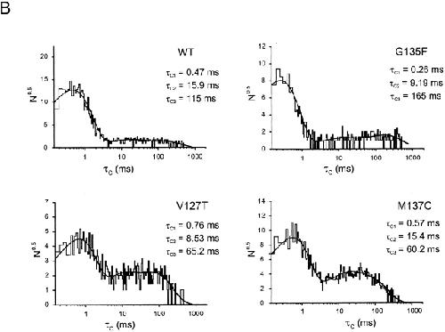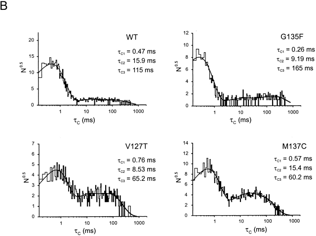 Figure 4. (A) Open time distributions measured at −60 mV for wild-type (WT) and mutant Kir6.2/SUR1 channels, as indicated. The lines are fitted to either one exponential (WT, G135F) or the sum of two exponentials (V127T and M137C) with the time constants indicated. (B) Closed time distributions measured at −60 mV for wild-type (WT) and mutant Kir6.2/SUR1 channels, as indicated. The lines are fitted to the sum of three exponentials with the time constants indicated.