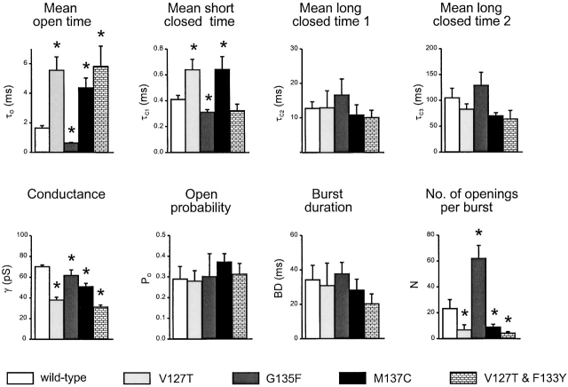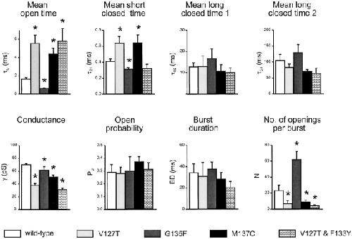 Figure 6. Mean kinetic parameters for wild-type and mutant channels measured at −60 mV (n = 5). *P < 0.05.