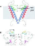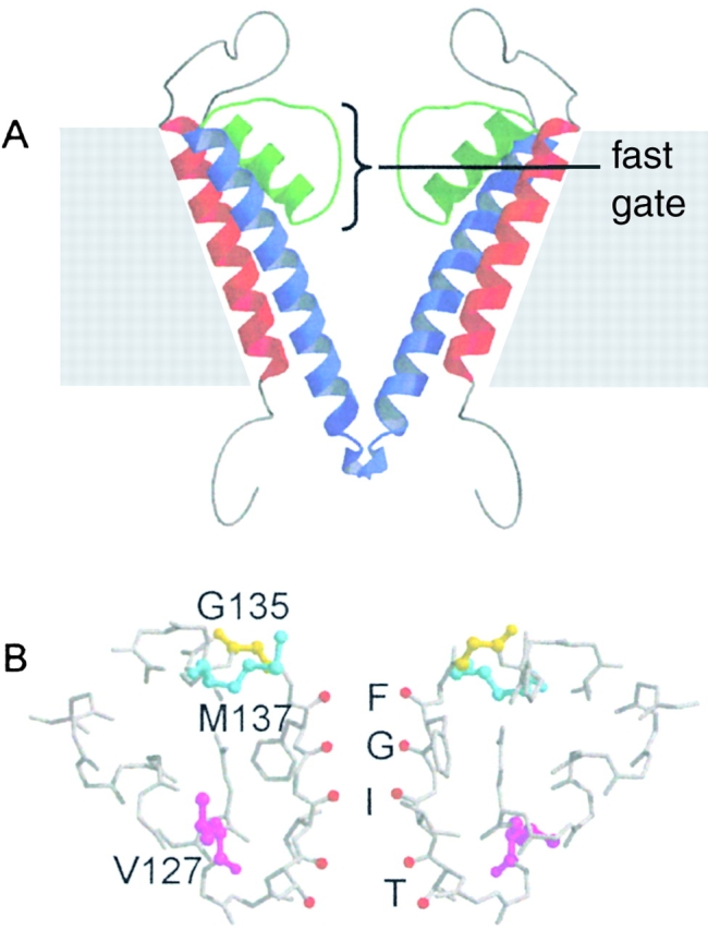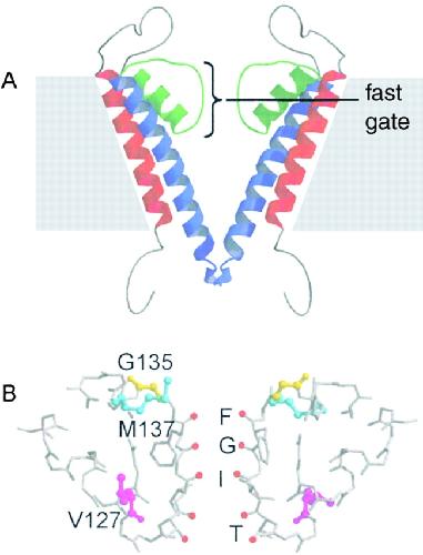 Figure 7. (A) Molecular model of the structure of the pore of Kir6.2 based on that of KcsA. The positions of the putative fast and slow gates are indicated. (red) M1-helix, (green) P-helix and filter, and (blue) M2-helix. (B) Molecular model of the selectivity filter of Kir6.2 based on that of KcsA. Residues that affect gating when mutated are highlighted ([magenta] V127, [yellow] G135; and [cyan] M137).
