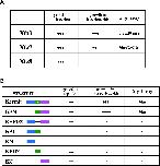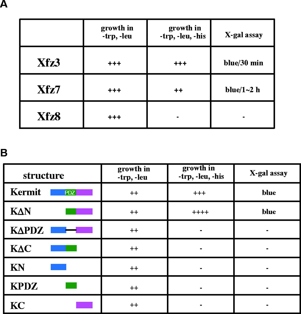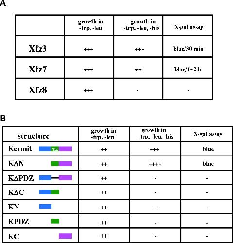 Interaction of Kermit with the C termini of Xfzs in yeast two hybrid assays. Yeast strain Y190 was transformed with Kermit or Kermit mutants and Xfz3, Xfz7 or Xfz8, plated on either nonselective medium (-trp, -leu) or selective medium (-trp, -leu, -his). Growth was checked 3 to 4 days later, and the hydrolysis of X-gal was monitored on filter lifts from all plates. Plus signs indicate size of colonies; minus sign indicates no growth (in left and middle columns) or no X-gal hydrolysis (right column). (A) Interaction of Kermit with the C termini of Xfz3, Xfz7 and Xfz8. (B) Domain requirement of Kermit in interaction with Xfz3. Blue, N terminus (amino acids 1-127); green, PDZ domain (amino acids 128-217); purple, C terminus (amino acid 218-331).