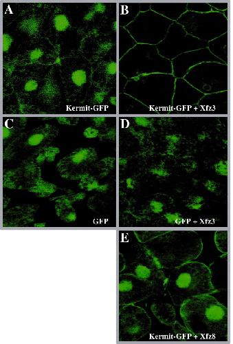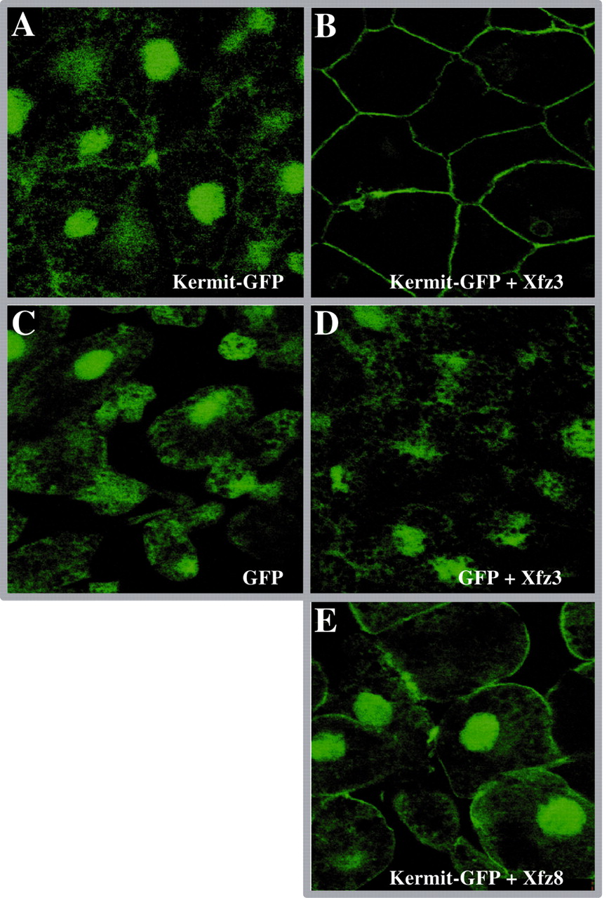 Xfz3 causes Kermit membrane translocation. Kermit-GFP or control GFP mRNA were injected into animal poles with Xfz3 or Xfz8 mRNA at the one-cell stage. Animal caps were dissected at stage 8, fixed and analyzed by confocal microscopy. (A) Kermit-GFP is localized to both cytoplasm and nucleus, similar to the GFP control (compare A with C). (B) Expression of Xfz3 causes a marked translocation of Kermit to the plasma membrane, with little remaining in the nucleus or cytoplasm. (C) Control expression of GFP, with localization in cytoplasm and nucleus. (D) Xfz3 expression has no effect on the distribution of GFP alone. (E) Xfz8 has only a small effect on Kermit subcellular distribution (compare A with E).