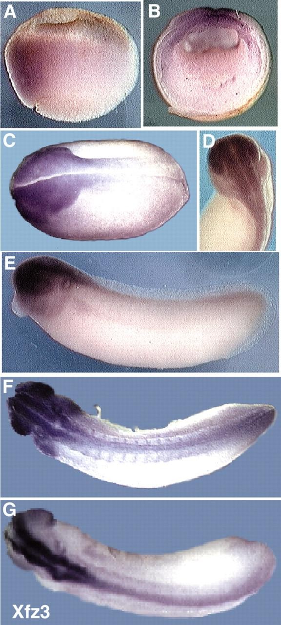 Fig. 3. Spatial pattern of Kermit expression. In situ hybridization was performed at early gastrula, early and late neurula, and tadpoles stages. (A) A stage 10+ gastrula, with the dorsal lip visible in the lower left. (B) A hemisection of a stage 14 neurulae, with dorsal oriented upwards; diffuse staining is visible in the neural plate, notochord, and paraxial mesoderm. (C) Strong staining in the anterior neural plate of a stage 18 neurula (anterior is towards the left). (D,E) Stage 26 and (F) stage 32 tadpoles, with kermit expression in the neural tube, eye, otic vesicle and branchial arches. (G) Expression of Xfz3 in a stage 32 tadpole.