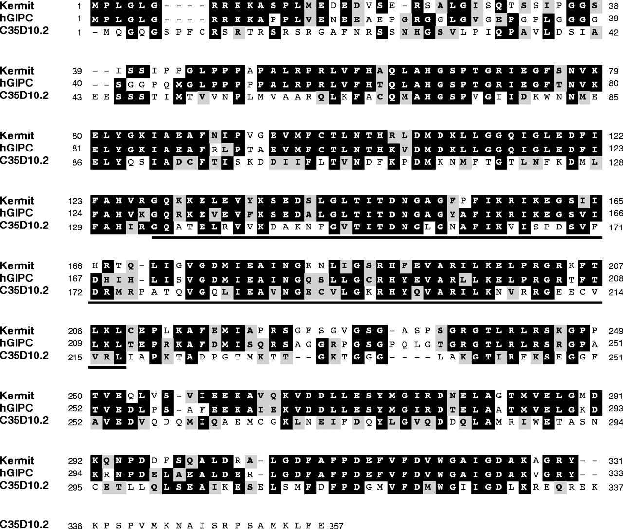 Sequence of Kermit. Deduced amino acid sequences from Kermit, human GIPC and C. elegans gene C35D10.2 were aligned using MacVector 6.0 ClustalW alignment. Identical amino acids are in black boxes and similar amino acids are in gray. The PDZ domain is underlined. Kermit sequence has been deposited into the GenBank database under Accession Number AF215838.