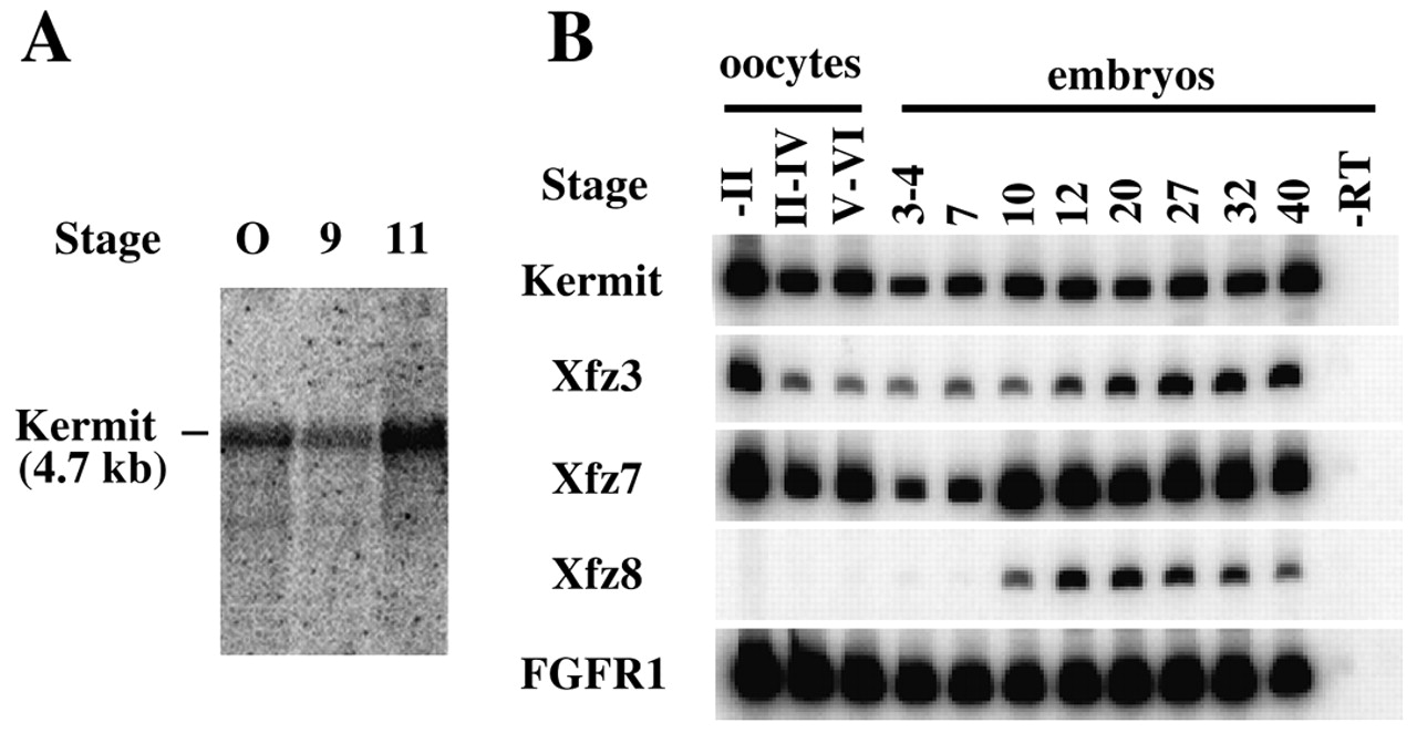 Temporal pattern of Kermit expression. (A) Northern blot of Kermit expression. Kermit was detected as a single band at 4.7 kb. Lanes 1 to 3: total RNA (20 μg) from oocytes, stage 9, and stage 11 embryos. (B) RT-PCR analyses of Kermit, Xfz3, Xfz7 and Xfz8 expression. Lanes 1 to 3: stage II, III-IV and V-VI oocytes. Lanes 4 to 11: RNA from stage 3-4, 7, 10, 12, 20, 27, 32 and 40 embryos. Lane 12: negative control without reverse transcriptase. FGFR1 was used as a loading control.