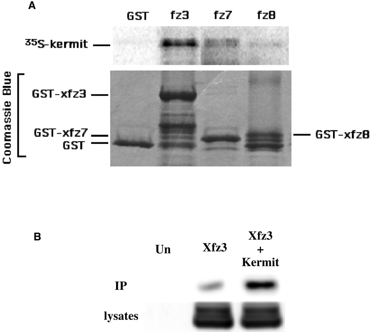 Kermit interacts with Xfzs in vitro and in Xenopus embryos. (A) In vitro binding: Xfz3, Xfz7 and Xfz8 C-termini purified as GST-fusion proteins were incubated with 35S-labeled Kermit (in vitro translated). Autoradiography (top panel) shows that Kermit bound strongly to the Xfz3 C terminus and weakly to Xfz7, but not to Xfz8. The lower panel shows Coomassie Brilliant Blue staining of the GST fusion proteins. (B) Co-immunoprecipitation of Kermit and Xfz3. Embryos were injected at the one-cell stage with mRNAs encoding Xfz3 and Myc-tagged Kermit, and cultured until the late blastula stage. Xfz3/Kermit complexes were immunoprecipitated from embryo lysates with anti-Myc antibody and Xfz3 was visualized by Western blotting.