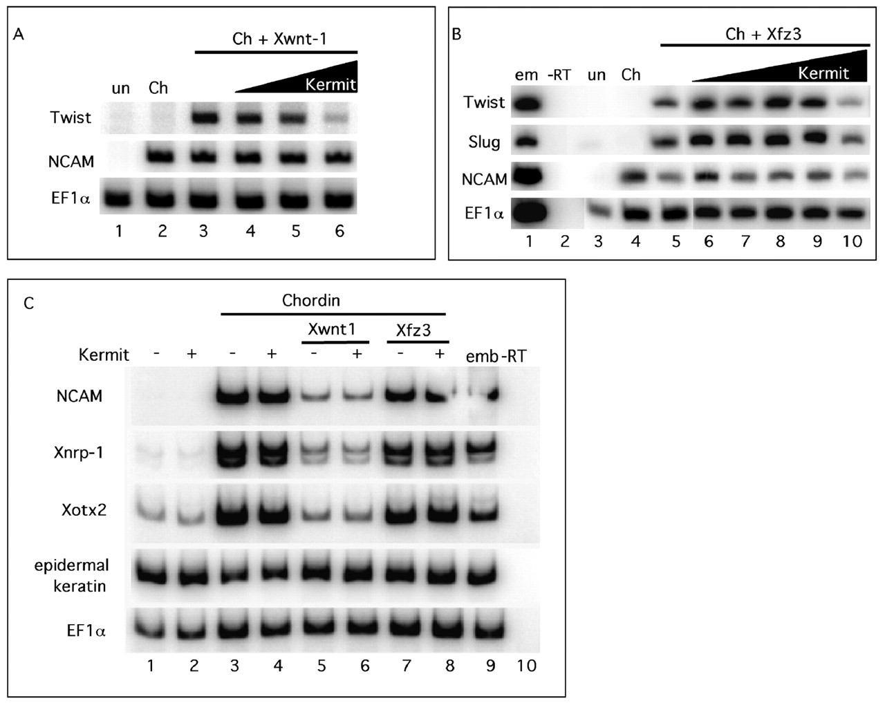 Overexpression of Kermit inhibits neural crest induction by Xwnt1 and Xfz3. mRNAs for chordin, Xwnt1 or Xfz3, and Kermit were injected into the animal pole of fertilized eggs. (A,B) Animal caps were dissected when embryos reached stage 8-9 and RNA was harvested at stage 18 for RT-PCR analysis using primers for Xtwist, Xslug, NCAM or EF-1α (as described in the Materials and Methods). (A) Kermit (0.12, 0.25 or 0.5 ng of Kermit mRNA) inhibits Xwnt1-dependent induction of the neural crest marker Xtwist in a dose-dependent manner. Xslug expression was also inhibited (not shown). (B) Kermit (0.004, 0.016, 0.06, 0.25 or 1.0 ng of Kermit mRNA) inhibits Xslug and Xtwist induction by Xfz3. EF-1α was used as a loading control. (C) Kermit does not affect expression of neural markers NCAM, Nrp1 and Xotx2, or of the epidermal marker keratin. Fertilized eggs were injected with mRNA for chordin (0.1 ng), Xwnt1 (0.1 pg), Xfz3 (0.13 ng) and kermit (1.0 ng), as indicated in the figure; animal caps were explanted at stage 8-9 and harvested at stage 25 for RT-PCR, as above.