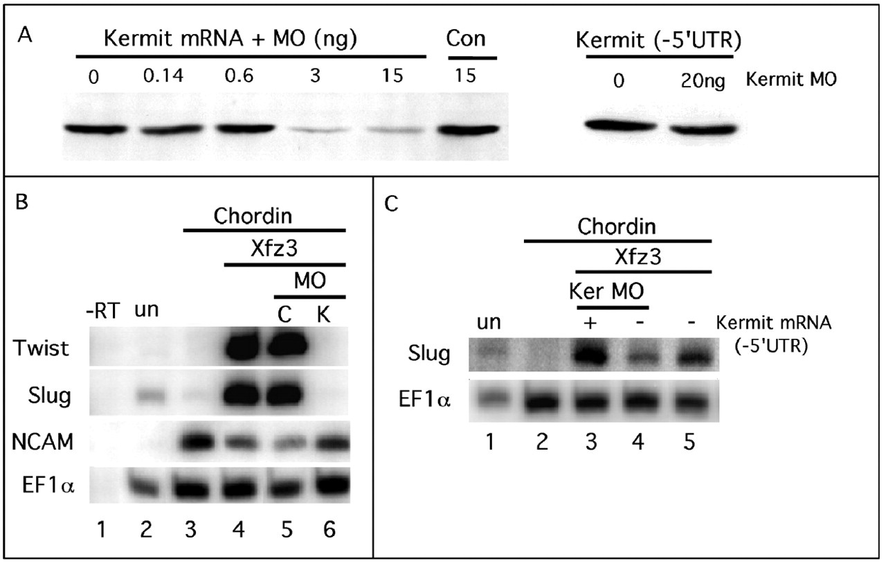 Kermit is required for neural crest induction by Xfz3. (A) Kermit morpholino antisense oligonucleotide (MO) directed against the 5â²UTR of Kermit mRNA blocks translation of Kermit protein. Kermit mRNA was injected into embryos with increasing concentrations of Kermit MO or control MO and embryo lysates were analyzed by western blotting with anti-NIP antibodies (which crossreact with overexpressed Kermit). Translation of Kermit mRNA lacking the 5â²UTR was not inhibited by the Kermit MO (20 ng MO; right panel). (B) Depletion of Kermit with antisense MO (4 ng; lane 6) reduces or eliminates neural crest induction by Xfz3 (lanes 4 and 6). Neural crest induction and RT-PCR were performed as in figure 7. Lane 1 is a no reverse transcriptase control; lane 2 shows uninjected control caps (un); lane 3 shows samples expressing chordin alone; lane 4 shows induction of neural crest makers by Xfz3 + chordin; lane 5 shows Xfz3 + chordin + control MO (C); and lane 6 shows Xfz3 + chordin + Kermit-MO (K). (C) Kermit mRNA lacking the 5â²UTR rescues inhibition by Kermit MO. Neural crest induction assay was performed as above. Kermit MO (4 ng) was injected (lanes 3, 4) with (+) or without (â) Kermit mRNA (10 pg) lacking the 5â²UTR.