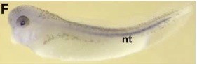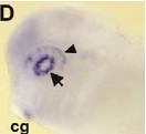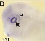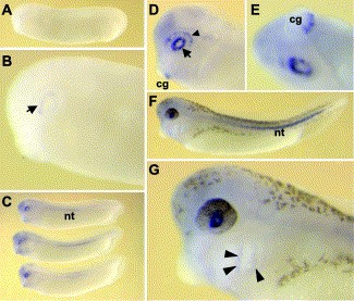 Fig. 2. Cx43 is expressed in the eye, cement gland, notochord and branchial arches. Cx43 is expressed as a ring in the eye of stage 25 embryos (A,B arrow). Cx43 expression in the eye (C,D, arrow indicate inner ring, arrowhead indicate outer ring), part of the notochord (nt) (C) and in the posterior part of the cement gland (cg) (C,E) in stage 32 embryos. Cx43 expression in the lens region of the eye (F,G), in the posterior notochord (F) and in the branchial arches (arrowheads) (G) of stage 37 embryos.