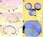 Fig. 3. Cx43 is expressed in the anteriorlensepithelium. Transverse sections showing confined Cx43 expression in the anteriorlensepithelium at stage 32 (A, arrows indicate inner ring, arrowhead indicates dorsal part of outer ring), 37 (B) and 40 (C). Cx43 expression in the anteriorepithelium of isolated stage 52/53 lenses (D), inset: sense control (E). Enlargement of D, displaying Cx43 expression in individual epithelial cells. (AâC) v, ventral; d, dorsal. (E) l, lateral; a, anterior.
