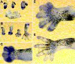 Fig. 4. Cx43 expression in developing fore- (A) and hindlimbs (B). Cx43 is expressed intensely and widely in the early limb bud, becoming restricted during mesoderm condensation, later outlining the precartilage and perichondrium, forelimbs stages 52â55, hindlimbs stages 53â56. Enlargements of B, showing details of Cx43 expression during cartilage formation. Stage 53 (C), stage 54 (D) and stage 56 (E). Brown dots are pigment cells.