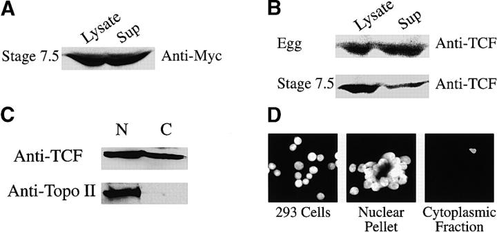 Figure 5. A significant fraction of total cellular TCF protein in Xenopus embryos and in cultured cells is nonnuclear. (A) Both cells of 2-cell embryos were injected with myc6-Tcf3 RNA (250 pg/ blastomere), gently homogenized at stage 7.5 (lysate), and centrifuged to pellet the nuclei (Sup). Equivalent volumes of lysate and supernatant were subsequently processed for Western analysis using an anti-myc antibody. Most of the detected myc-tagged Tcf3 is present in the supernatant fraction. (B) Xenopus eggs and stage 7.5 embryos were processed as described for the myc6-Tcf3 RNA injected embryos except that an anti-Tcf antibody was used to detect endogenous Tcf. Nearly all of the Tcf detected is present in the supernatant fraction of eggs in contrast to stage 7.5 embryos. Lysates and supernatants were stained with Hoechst to confirm the presence (lysates) or absence (supernatants) of intact nuclei (unpublished data). Nuclear and cytoplasmic preparations from cultured 293 cells were blotted for topoisomerase II (C) and Tcf and stained with Hoechst (D). The nuclear pellet was brought to the same volume as the cytoplasmic fraction, and equivalent volumes were used for Western analysis.