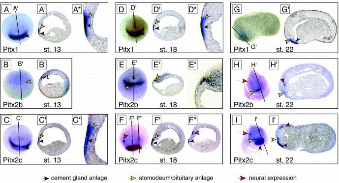 Fig. 2. Ectodermal expression of Xenopus Pitx genes at neurula stages. (AâC) Early neurula (stage 13), (DâF) mid-neurula (stage 18), (GâI) late neurula (stage 22). Lines indicate approximate levels of sections. (A*) and (C*âE*) show larger magnifications of sections. Note that Pitx1 and Pitx2c were co-expressed in the primordia of the cement gland (black arrow; A,C,D,F,G,I) and the stomodeum/pituitary (yellow arrow; (AâI)), while Pitx2b was resticted to the deep layer cells fated to become pituitary (B,E,H). Note also that Pitx1 was not expressed in the neuroectoderm, whereas Pitx2b and Pitx2c RNAs were found in neural tissue (red arrows; (F,H,I)).