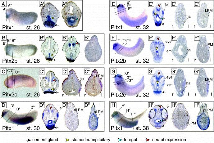 Fig. 3. Expression of Pitx genes in Xenopus tadpoles. Co-localization of Pitx1 and Pitx2c mRNA was found in the cement gland (black arrow; (A,C,E,G)). All three genes were co-expressed in the pituitary and stomodeum (yellow arrows; (AâC), (EâG)) and in the midbrain (EâG). Exclusive expression of Pitx1 was found in the foregut (blue arrow; (A,D,E,H)), lens (D+E), and posteriorlateral plate mesoderm (pLPM). (C) and (G) show the asymmetric expression of Pitx2c in the leftLPM and heart anlage, where Pitx1 and Pitx2b were not detected (B,DâF). Lines indicate approximate levels of sections. aLPM, anteriorLPM; em, eyemuscle; ha, heart anlage; hm, headmesenchyme; le, lens; LPM, lateral plate mesoderm; pLPM, posteriorLPM.