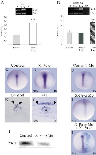 Fig. 2. Presenilin modulates X-shh expression. (A, B) Quantitative RT-PCR analysis of X-shh transcripts at stage 145. After Ps1 mRNA bilateral injection, Ps1 increased 122% the X-shh/Ef1a ratio (P D 0X001, n ï° 3) (A). Bilateral delivery of 2 ng of the mutant D385A Ps1 mRNA did not signiantly increase the X-shh/Ef1a ratio. However, delivery of 4 ng of the mutant Ps1 mRNA increased 85% the X-shh/Ef1a ratio (P D 0X01, n ï° 2) (B). The constitutively expressed Ef1a transcript was used for normalizing results. Expression levels were compared using the t-test; SEMs are indicated by error bars; n, number of independent experiments, each consisting of RNA samples from ten control or injected embryos that were reverse transcribed and then subjected to quantitative PCR analysis by quadruplicate. On the top of each panel is shown the corresponding ethidium bromide-stained agarose gel of one representative determination. C, control embryos. Minus RT (PRT), PCR ampliation without reverse transcriptase. (C) WMISH for X-shh showing that presenilin is able to modulate X- shh expression. The pale blue staining indicates the location of the nucb -gal tracer. IS, injected side. NIS, non-injected side. Dorsal views of control (C), X-Ps- a - (D), standard control morpholino oligo- (control Mo) (G), X-Ps-a Mo- (H), and X-Ps-a Mo I X-Ps-a - (I) injected embryos, stage 134. Cross-sections of control (E) and Ps1-injected (F) embryos, stage 14. Compare arrowheads between (E, F), showing an expanded distribution of X-shh transcripts in the Ìoor plate domain. The notochord (n) was unaffected. (J) Western blots of neural plate extracts with anti-PSCT. An 180-kDa immunoreactive band consistent with X-PS CTF endoproteolytic product is reduced in X-Ps-a Mo-injected embryos.